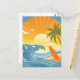 Design redonda de uma cena de praia com uma pequena ilha a esportar uma palmeira e uma ascensão de conselho surf da areia, rodeada por ondas azuis sob o sol. Este cartão postal é totalmente personalizável.