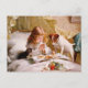 Vintage illustration of a lovely young girl praying before having breakfast in bed while a cute little kitten and a small dog are watching, eager to catch a piece of food. Oil on canvas by Charles Burton Barber.