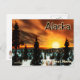 Inverno na taiga ártica. Com o sol baixo no horizonte a neve brilha e o céu queima laranja e amarelo. Texto lendo "Alasca" também aparece. Adicione seu próprio texto adicional.