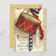 Este cartão postal de vintage apresenta uma ilustração vintage de um tambor com fitas vermelhas, brancas e azuis com estrelas sobre elas. Em ambos os lados estão notas musicais. Este cartão-postal foi criado por Ellen Hattie Clapsaddle, que foi um dos artistas mais prolíficos durante o apogeu do cartão-postal no início do século 20. Aproveite seu novo cartão postal de tambor Patriótico Vintage!