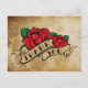 Tatuagem Rosa Obrigado. Uma ilustração de uma tatuagem de excelente de uma rosa vermelha em um papel de pergaminho vintage, fundo em apuros.