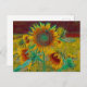 Focado em três girassóis altos em um campo de girassóis vistos em fundo turvo. As folhas verdes estão em cor lacrimejante com tons de vermelho adicionados aos girassóis em floração.