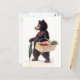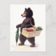 Ursinho de pelúcia com um cesto de maçãs e um vegetal verde-folha sob um braço e um guarda-chuva na sua pata, numa ilustração de safra de um livro infantil de 1907.