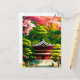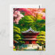 Um templo japonês pacífico cercado por flores de cereja e arte de árvores verdes.