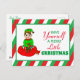 Bonita mão puxou elfo festivo de Natal sentado no saco de brinquedos de Papai noel. Cartaz festivo de Natal vermelho, verde e branco que pode ser personalizado nas costas com uma mensagem personalizada.