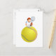 Ótima ilustração de um pequeno jogador de tênis feliz em cima de uma bola gigante de tênis com sua raquete em uma mão. Talvez ele apenas jogue por diversão ou talvez seja um desportista profissional. Imagem disponível em vários presentes e produtos.