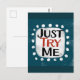 Um design tipográfico divertido que diz "Apenas me tente". É texto preto e vermelho em um retângulo branco com pontos brancos engraçados e brincalhões ao seu redor, todos sobre um fundo lacrimogêneo.