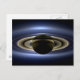 No dia 19 de julho de 2013, em um evento celebrado pelo mundo todo, a nave Cassini da NASA deslizou para a sombra de Saturno e virou para a imagem do planeta, sete de suas luas, seus anéis internos — e, ao fundo, nosso planeta, a Terra. Com os poderosos e potencialmente prejudiciais raios solares eclipados por Saturno, as câmeras de bordo da Cassini foram capazes de aproveitar essa única geometria de visão. Eles adquiriram um mosaico panorâmico do sistema Saturno que permite aos cientistas ver detalhes nos anéis e em todo o sistema à medida que são iluminados de volta pelo sol. Este mosaico é especial, pois marca a terceira vez que nosso planeta foi imaginado a partir do sistema solar externo. a segunda vez que foi fotografada pela Cassini a partir da órbita de Saturno; e a primeira vez que os habitantes da Terra foram informados antecipadamente que a sua fotografia seria tirada a uma distância de tão excelente. Com ambas as câmeras de ângulo largo e de ângulo estreito da Cassini voltadas para Saturno, a Cassini conseguiu capturar 323 imagens em pouco mais de quatro horas. Este mosaico final usa 141 dessas imagens de grande ângulo. As imagens tiradas usando os filtros espectrais vermelho, verde e azul da câmera de ângulo largo foram combinadas e mosaicas juntas para criar esta vista de cor natural. Uma versão mais clara com contraste e cores melhoradas (Figura 1), uma versão com apenas os planetas anotados (Figura 2) e uma versão anotada (Figura 3) são mostrados acima. Esta imagem percorre cerca de 404.880 milhas (651.591 quilômetros) de diâmetro. O anel mais externo mostrado aqui é o anel E de Saturno, cujo núcleo está situado a cerca de 149.000 milhas (240.000 quilômetros) de Saturno. Os geisers que erupem do terreno polar sul da lua Enceladus fornecem as finas partículas geladas que compõem o anel E; a difração por luz solar dá ao anel sua cor azul. Enceladus (313 milhas, ou 504 quilômetros de diâmetro) e a pluma extensa formada pelos seus jatos são visíveis, embutidos no anel E no lado esquerdo do mosaico. Na posição das 12 horas e um pouco para dentro do anel E está o anel mal discernível criado pela pequena, descoberta pela Cassini, Pallene (3 milhas, ou 4 quilômetros de diâmetro). (Para obter mais informações sobre estruturas como o anel de Pallene, consulte PIA08328). O próximo anel estreito e facilmente visto para dentro é o anel G. Dentro do anel G, perto da posição das 23 horas, mal se vê o anel mais difuso criado pelas luas co-orbitais, Janus (111 milhas, ou 179 quilômetros de diâmetro) e Epimetheus (70 milhas, ou 113 quilômetros de diâmetro). Mais para dentro, vemos o brilhante anel F cercando de perto os anéis principais de Saturno. Seguindo o anel E mais externo, no sentido anti-horário, de Enceladus, a lua Tethys (662 milhas, ou 1.066 quilômetros, de diâmetro) aparece como uma grande órbita amarela bem fora do anel E. Os raios são colocados no lado iluminado de Saturno; sua superfície gelada brilha intensamente a partir da luz do sol amarela refletida por Saturno. Continuar a cerca das 2 horas é um pixel escuro fora do anel G; este pixel escuro é a lua da Estrela da Morte de Saturno, Mimas (246 milhas, ou 396 quilômetros de diâmetro). Mimas aparece, sob uma inspeção atenta, como uma crescente muito fina porque a Cassini está a olhar principalmente para a sua face não iluminada. As luas Prometeu, Pandora, Janus e Epimetheus também são visíveis no mosaico próximo ao brilhante anel F de Saturno. Prometeu (53 milhas, ou 86 quilômetros de diâmetro) é visível como um ponto preto fraco apenas dentro do anel F e na posição das 9 horas. Do lado oposto dos anéis, logo fora do anel F, Pandora (50 milhas, ou 81 quilômetros de diâmetro) pode ser vista como um ponto branco brilhante. Pandora e Prometheus são luas pastoras e interações gravitacionais entre o anel e as luas mantêm o anel F estreito. Na posição das 23h entre o anel F e o anel G, Janus (111 milhas, ou 179 quilômetros de diâmetro) aparece como um ponto preto fraco. Janus e Prometheus são escuros pela mesma razão que Mimas é na sua maioria escuro: estamos a olhar para os seus lados não iluminados neste mosaico. A meio caminho entre o anel F e o anel G, na posição das 8 horas, é um pixel brilhante do solteiro, Epimetheus. Olhando mais de perto para Enceladus, Mimas e Tethys, especialmente na versão iluminada do mosaico, pode-se ver essas luas lançando sombras através do anel E, como um poste de telefone poderia lançar uma sombra através de um nevoeiro. Na versão não iluminada do mosaico, pode-se ver grumos brilhantes de material do anel orbitando-se dentro da fenda do Encke perto da borda externa dos anéis principais e imediatamente para a parte inferior esquerda do globo de Saturno. Também, no anel escuro B dentro dos anéis principais, na posição das 9 horas, pode-se ver os contornos tênues de duas feições faladas, vistas pela primeira vez pela nave Voyager da Nasa no início dos anos 1980 e estudadas extensivamente pela Cassini. Finalmente, no canto inferior direito do mosaico, entre o brilhante anel azul E e o fraco mas definido anel G, está o ponto azul pálido do nosso planeta, Terra. Olhem de perto e vocês podem ver a lua se projetando da parte inferior direita da Terra. (Para ver a Terra e a Lua da resolução do mais alto tiradas durante esta campanha, veja PIA14949.) O gêmeo da Terra, Vênus, aparece como um ponto branco brilhante no quadrante superior esquerdo do mosaico, também entre os anéis G e E. Marte também aparece como um ponto vermelho fraco embutido na borda externa do anel E, acima e à esquerda de Vênus. Para facilitar a visibilidade, Terra, Vênus, Marte, Enceladus, Epimetheus e Pandora foram todos iluminados por um fator de oito e meio em relação a Saturno. O Tethys foi iluminado por um fator de quatro. No total, 809 estrelas de fundo são visíveis e foram iluminadas por um fator q