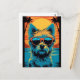 Design de um Terrier vestindo óculos de sol em uma praia tropical.