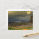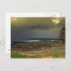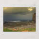 Olhando sobre uma plataforma rochosa sobre o surf para nuvens de tempestade e chuva, com um penhasco no lado direito.