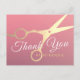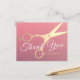 Modelos de cartões-postais de agradecimento para salão de cabelereiro / cabeleireiro / estilista / salão de beleza / maquiadores / estilistas / planejadores de casamento / organizadores de eventos / consultores / proprietários de boutiques / fashionistas - Tesoura Dourada Falsa Moderna em Fundo Rosa Gradiente.