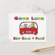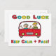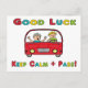 O teste Good Luck Driving mostra que um motorista aprendiz fazendo o teste com uma mensagem Good Luck e uma dica Keep Calm and Pass abaixo. Uma design divertida para aqueles que estão prestes a fazer o teste.
