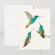 Postcard for hummingbird lovers featuring a hand-painted Versicolored Emerald Hummingbird and two Rufous-tailed Hummingbirds.