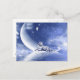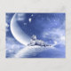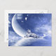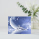 White tiger lies on a crescent moon over reflecting water with fairies or pixies around fantasy postcard