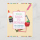 Cartão-postal de boas-vindas à escola com frasco de cola, lápis rosa, maçã vermelha e molduras de fotos fofas. Bordas coloridas fofas no topo e na parte inferior. Tipografia "Bem-vindo à Escola" com um modelo criado para você.