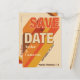 Um cartão postal "save the date" descolado com o estilo de um pôster de concerto. O texto com sombra alongada e listras diagonais em diferentes cores estende-se pelo cartão, enfatizando a mensagem "Save the Date". Uma primeira impressão única e muito legal para o seu casamento com vibrações retrô - quando seus convidados receberem este cartão postal, saberão que a diversão está por vir. Tipografia ousada. Cores autênticas dos anos setenta: laranja queimado, vermelhos e marrons. Tipografia retrô ousada para um clima retrô dos anos setenta. O verso do cartão é laranja com detalhes listrados nos cantos, um local onde você pode adicionar mais informações e um código QR para que os convidados possam visitar o site do seu casamento.