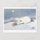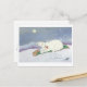 Um urso polar está a ir a uma colina de neve, com montanhas roxas ao fundo. Vocês também verão tanto o sol quanto a lua. Ao redor do pescoço, o urso veste um colar de Natal com um homem de pão de gengibre e uma cana doce.