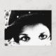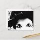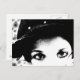 Um mini impressão de olhos de uma jovem, preto e branco. Csobrancelhas manicadas e cabelos escuros ricos chamam sua atenção. Ela está a usar um chapéu moderno e moderno com pedras pequenas. Isso pareceria excelente em um quadro preto em negrito.