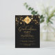 Um convite elegante e simples para uma festa de formatura tanto para ele quanto para ela. Fundo preto e um topo de borla abstrata preta moderna em dourado falso com o ano dentro. Decorado com estrelas douradas caindo. Personalize e adicione um nome e detalhes da festa. O texto Formatura e o nome são escritos com estilo de letra manuscrita moderna. Texto em cor dourada. Verso: design de postal.