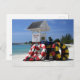 Uma torre salva-vidas fica vazia, numa praia de areia branca com água azul e céu azul por toda a parte. Fotografado na Jamaica.