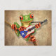 Este design do artista Jeff Bartels apresenta um pequeno sapo de árvore verde segurando uma guitarra acústica riscada e vestida. A bandeira de Porto Rico é pintada no velho violão dando-lhe um olhar patriótico. O adorável músico do sapo da árvore está sentado em um pequeno galho e está olhando para frente com seus grandes olhos vermelhos. A cabeça e o corpo pequenos, além dos detalhes na pele e no violão, criam uma bela combinação de desenho animado e aparência realista. Este padrão único e patriótico guitarrista sapo de árvore porto-riquenha é perfeito para todos os amantes de animais e música.