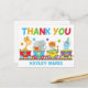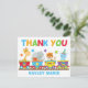 Este cartão de agradecimento de aniversário de animal de circo apresenta animais do zoológico em uma safári. O trem contém uma girafa, elefante, tigre e um hipopótamo fofo acima do monograma de suas crianças escrito sob cores laranja, verde, vermelho e azul.