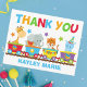 Este cartão de agradecimento de aniversário de animal de circo adorável apresenta animais do zoológico em uma safári. O trem contém uma girafa, elefante, tigre e um hipopótamo fofo acima do monograma de seus filhos escrito sob cores laranja, verde, vermelho e azul legais.