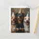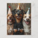 A imagem apresenta três cães sentados juntos, cada um usando um chapéu de festa colorido. Os cães, provavelmente uma mistura de uma espécie de Labrador, um Outro, e um Corgi, estão todos sorrindo com expressões felizes, dando à cena um clima alegre e comemorativo. O fundo é uma parede de madeira com alguns pedaços de confete espalhados, aumentando a atmosfera festiva.