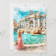 Este postal apresenta um retrato a aquarelas de uma mulher loura que joga uma moeda na fonte Trevi, em Roma, Itália.