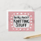 "Estou toda sobre Coisas de Tricô" é um design de texto fofo em rosa com texto preto e vermelho, juntamente com uma forma de destaque branca e pontos caprichosos texturizados brancos ao redor.
