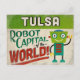Um cartão postal engraçado de viagens vintage de Tulsa Oklahoma apresentando um robô amigável com texto divertido no estilo retrô que diz, "Tulsa, Robô Capital do Mundo!"