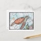 Um belo cartão postal com uma tartaruga marinha nadando no oceano profundo cercado por bolhas e flora.