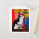 Cartão Postal Tuxedo cat com daffodils em um vaso azul