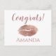 Um parabenização chique, este cartão postal apresenta um lindo par de lábios no meio. Acima dos lábios está "Parabéns" escrito em linda fonte cursiva cor de mauve com o nome dela escrito abaixo do design. Isso faz um ótimo cartão postal para uma nova mãe, mulher recém-noiva, mulher recém-casada ou uma mulher que comemora uma promoção no trabalho, formatura, etc. Personalize o seu hoje!