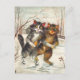 Ilustração vítrea de um casal de gato antropomórfico com as mãos e patinando gelo, tendo feliz no inverno. Que romântico! Artista: Maurice Boulanger