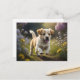 A imagem mostra um pequeno filhote brilhante em movimento, correndo em direção ao visualizador. O fundo consiste num jardim iluminado com flores roxas e folhas verdes, criando uma atmosfera quente e tranquila. Há flores amarelas perto do chão que o filhote parece que está correndo ao lado delas. A iluminação sugere que é cedo ou tarde, e o sol cria uma iluminação suave ao redor da cena.