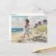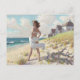 Cartão PinUp clássico mostrando uma linda garota pinUp em um biquíni branco posando na praia, pintado por Arthur Sarnoff (1912-2000)