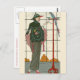 Estilo Art Deco Ilustração de George Barbier de uma Jovem vestindo um turno excessivo com uma manga bordada natural. Ela está parada ao lado de um papagaio numa bancada.