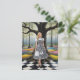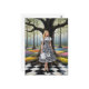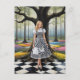 A IA gerou uma mulher loira em um vestido preto e branco com um cheque preto e branco em um chão com caixa preto e branco em uma floresta mágica colorida de xadrez