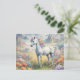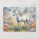 Um cartão postal mostrando uma imagem sonhadora de um unicórnio branco com um mané arco-íris parado em um campo de flores. Ao fundo estão montanhas majestosas. O presente perfeito para dar àqueles que amam unicórnios mágicos e místicos. Contém conteúdo generativo.
