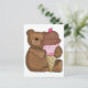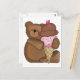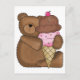Um adorável ursinho de pelúcia sentado e agarrado ao seu cone gigante de sorvete com uma colher de sorvete de chocolate e uma colher de morango.