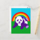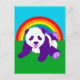 Um belo panda roxo senta-se alegremente em frente a um arco-íris fofo sobre grama verde abaixo do céu azul bonito. Um belo e esquisito selo de urso panda para um amante de os animais.
