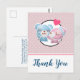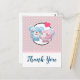 Cartão postal de agradecimento de festa com uma imagem de desenho animado fofa de um casal de ursos, a ursa é rosa pastel com um laço e está beijando a bochecha de um urso azul que parece positivamente encantado. Um pequeno coração rosa está flutuando acima de suas cabeças. Muito fofo e kawaii. O padrão de fundo é uma cor rosa suave com bolinhas brancas. Mensagem personalizada no verso.