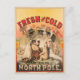 Anúncio venenoso de uma cena no Polo Norte onde ursos polares estão desfrutando canecas de cerveja ávida, com efeito trompe-l'oeil mostrando pessoas sobreaquecidas, com fãs e raios de sol, e um homem chegando a cena por uma gelada caneca fresca e fria de cerveja ávida oferecida a ele por um urso polar.