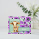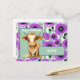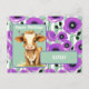 Uma adorável vaca de desenho animado está centrada no quadro com uma saudação de "Feliz Aniversário" acima dela e "XOXO" abaixo dentro de uma faixa verde. O fundo é decorado com um padrão de flores de papoula-anêmona roxas.