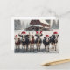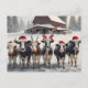 Vacas de Natal engraçadas em um pasto de neve em frente a um celeiro vermelho