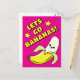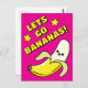 Cartaz adorável, com um desenho animado, banana amarela feliz kawaii com os sorrisos mais doces, olhos redondos grandes e meio pelados. Acima dele, em letras amarelas, com uma sombra negra lendo 'Vamos Bananas!' Duas estrelas amarelas brilhantes são de ambos os lados das palavras.