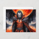 vampiro se posiciona em uma paisagem escura e sombria sob uma lua vermelha, com morcegos voando e castelos ao fundo.