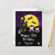 Este cartão de aniversário divertido e assustador pode ser personalizado com um nome ou título, como filha, neta, sobrinha, amiga, etc. Ele apresenta vampiros fofos ao lado de uma casa assombrada torta. Ao fundo, há uma lua cheia com morcegos e um céu noturno roxo com estrelas. O texto combina fontes decorativas e serifadas para um visual elegante e moderno. Isso é perfeito para o Halloween.