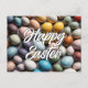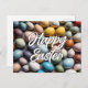 Este cartão postal vibrante apresenta uma variedade de ovos coloridos de Páscoa.
